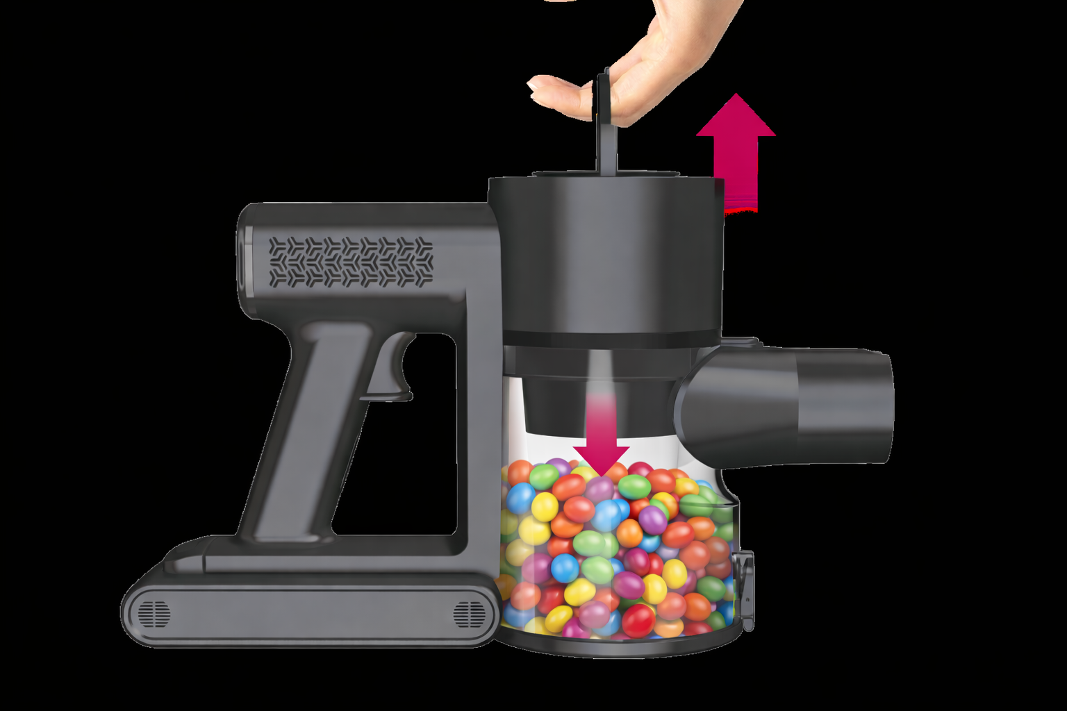 En tirant sur la poignée, notre système compresse automatiquement la poussière, les débris et les cheveux directement dans le bac de récupération. Les déchets sont tassés de manière homogène, ce qui augmente la capacité du bac et limite la fréquence de vidage.